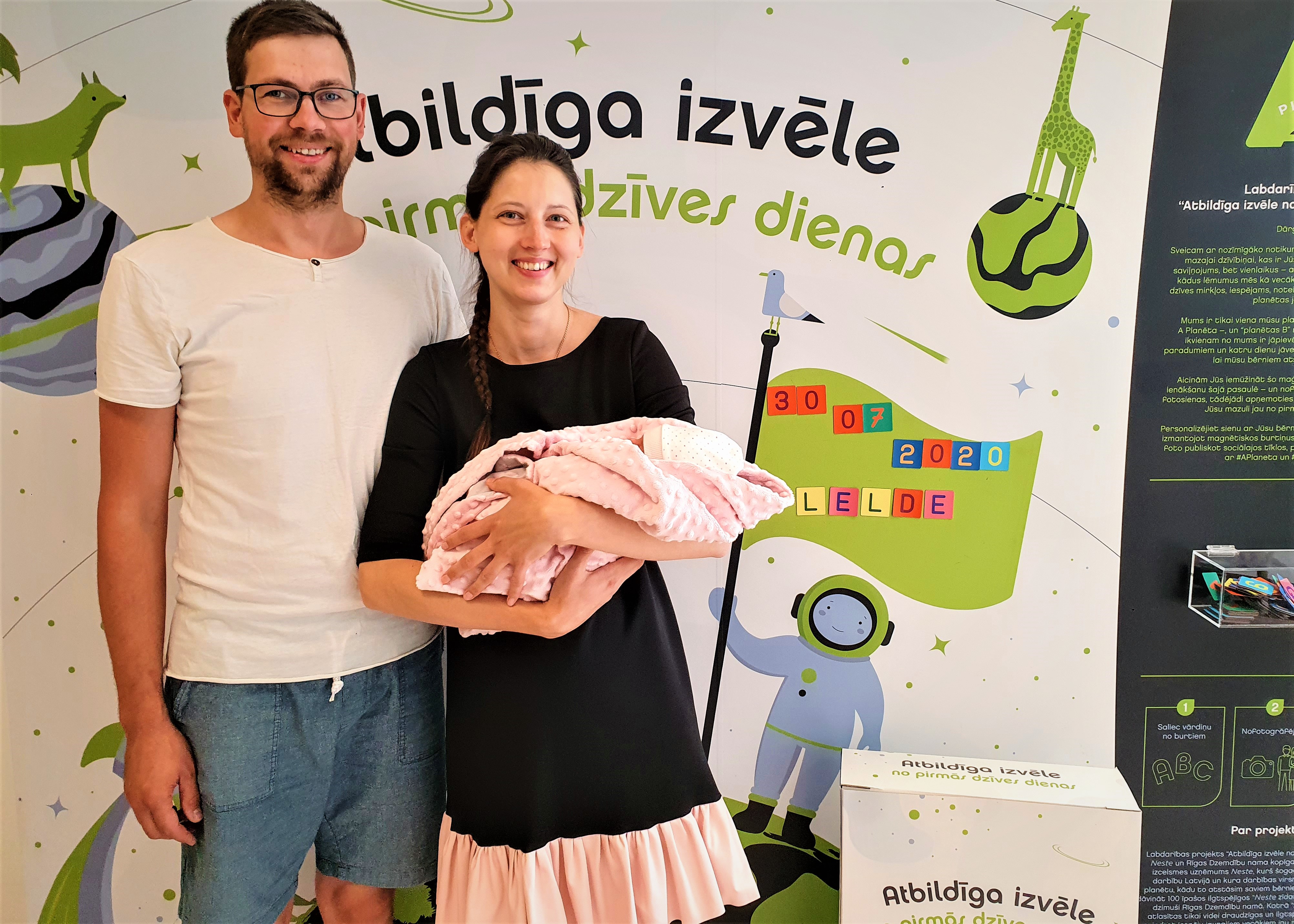 Mazā Liāna ar vecākiem Kristīni un Dmitriju fotografējas pie īpašās foto sienas "Atbildīga izvēle no pirmās dienas!"