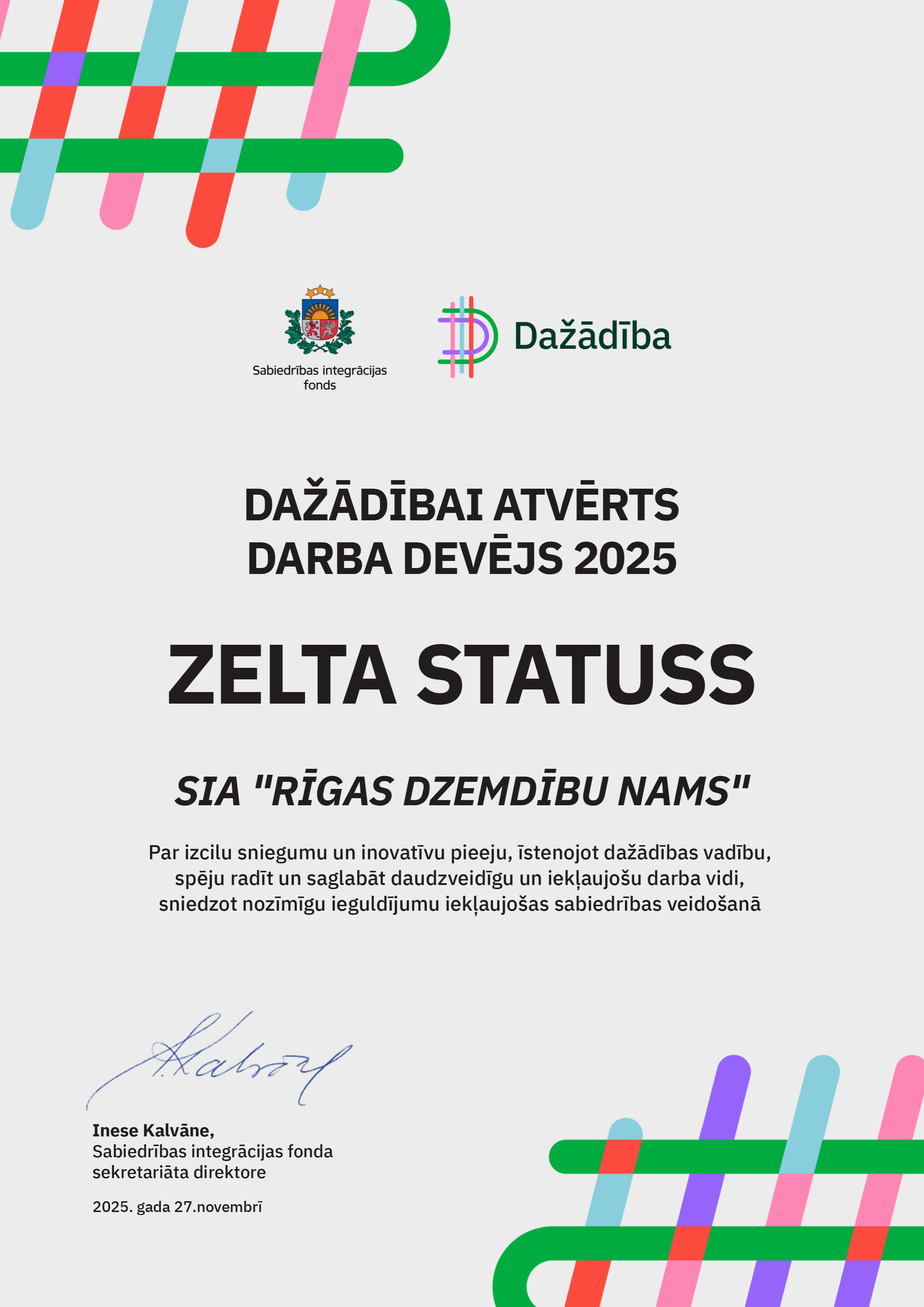 Augstāko novērtējumu – ZELTA STATUSU – par izcilu sniegumu un inovatīvu pieeju, īstenojot dažādības vadību, spēju radīt un saglabāt daudzveidīgu un iekļaujošu darba vidi, sniedzot nozīmīgu ieguldījumu iekļaujošas sabiedrības veidošanā, saņēma 15 darba devēji, viņu vidū - Rīgas Dzemdību nams.